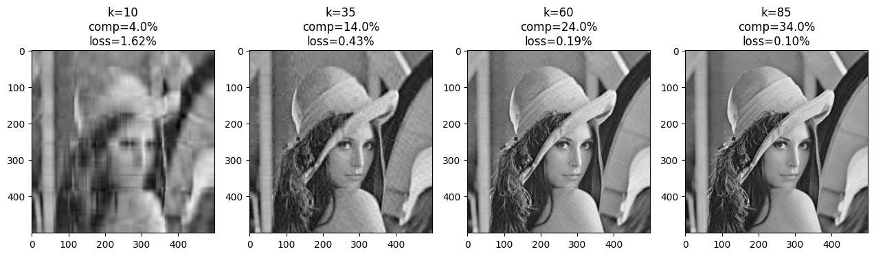 초반엔 큰 값을 보이고 있지만, 이후로는 급격히 작아지는 것을 볼 수 있습니다. 즉, 작은 singular value를 제거해도 손실되는 정보가 많지 않다는 뜻입니다. \( k \)를 늘려가며 복원된 이미지를 살펴보겠습니다.